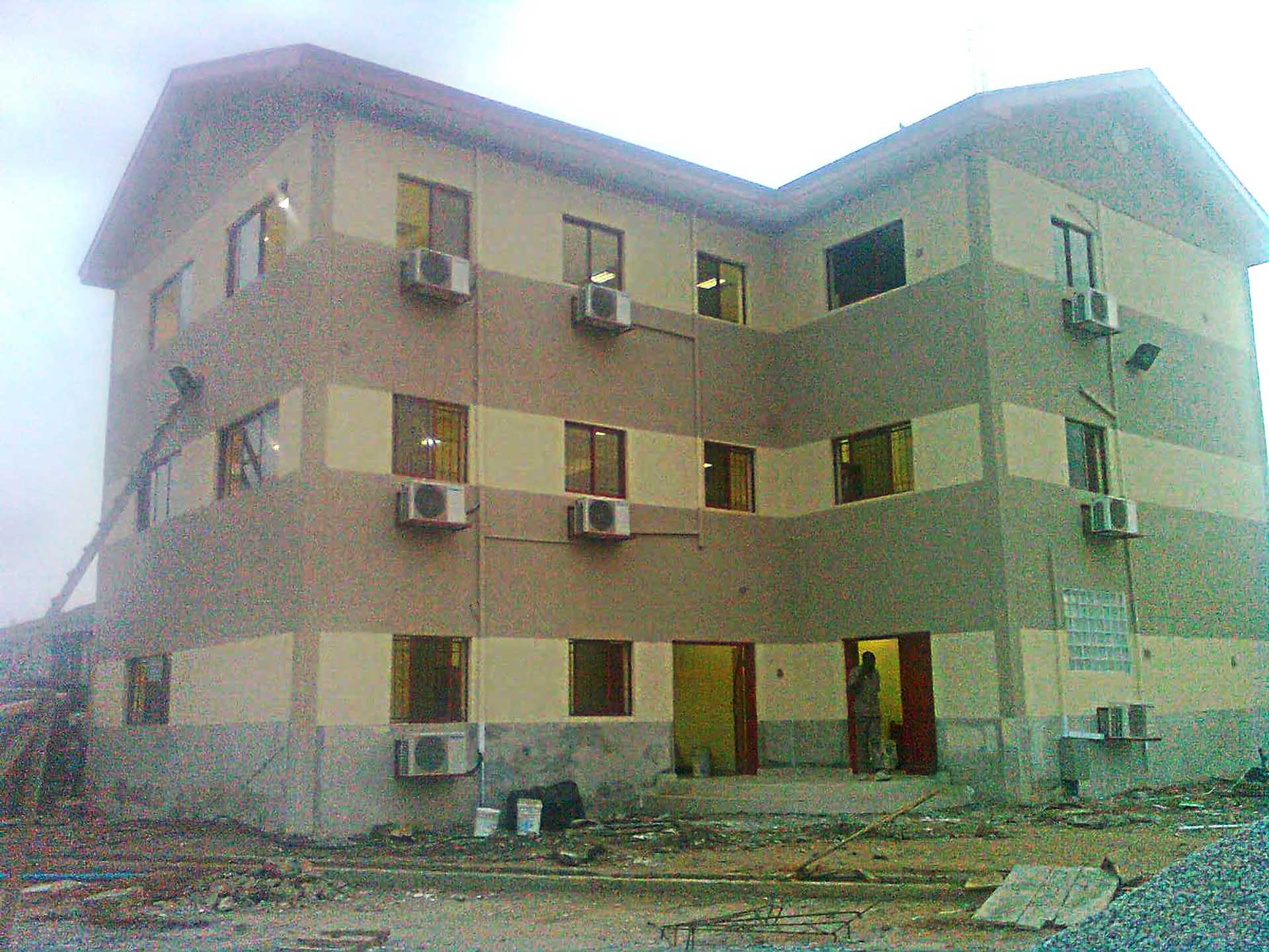 It consists of a two reinforced Concrete framed 2 storey office building with an adjoining steel-framed bus service workshop. Built from the Reinforced concrete foundation to long-span Aluminum roofing; All walls were floors finished in non-slip tiles, all glazing are Aluminum framed brown colour tinted windows, Doors a combination of hardwood flush doors for interior and steel doors for all external doors. Plumbing works entailed the building of a septic tank with servicing inspection chambers and connecting pipes.